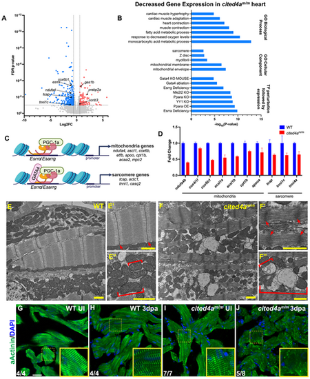 cited4a-deficient hearts show altered mitochondrial and sarcomere structures during regeneration. (A) Volcano plot of RNA-seq from cited4am/m ventricles at 3 dpa versus WT. Significantly decreased transcripts (blue), significantly increased transcripts (red), transcripts with no significant change (gray). (B) Biological process GO-terms, cellular component GO-terms and transcription factor (TF) perturbation-associated gene expression signatures with significant overlap associated with significantly decreased genes in cited4am/m heart at 3 dpa versus WT. (C) Esrrα/Esrrγ regulate CM maturation via induction of mitochondria and sarcomere gene expression. Created in BioRender by Forman-Rubinksy, R. (2025). https://BioRender.com/z08oupu. This figure was sublicensed under CC-BY 4.0 terms. (D) Representative qPCR validation of decreased mitochondria and sarcomere genes from bulk RNA-seq. Error bars represent standard deviation of technical replicates. Experiment was performed three times, showing consistent trends. (E-E″) TEM of a WT 3dpa ventricle showing clear intact sarcomere structures (M-band, A-band, I-band and z-disc) and mitochondria with densely packed cristae. (F-F″) TEM image of a cited4am/m mutant 3 dpa heart showing a thick z-disk and dysmorphic mitochondria with fragmented cristae. Arrows indicate sarcomere z-disc. Bracket indicates a single mitochondrion. (G-J) Immunostaining of α-Actinin to mark sarcomere z-disk and DAPI in uninjured (UI) WT (n=4) (G), injured (3 dpa) WT (n=4) (H), UI cited4am/m (n=7) (I) and injured (3 dpa) cited4am/m (n=8) (J) ventricles. Yellow scale bar:1 µm. White scale bar: 20 µm. |