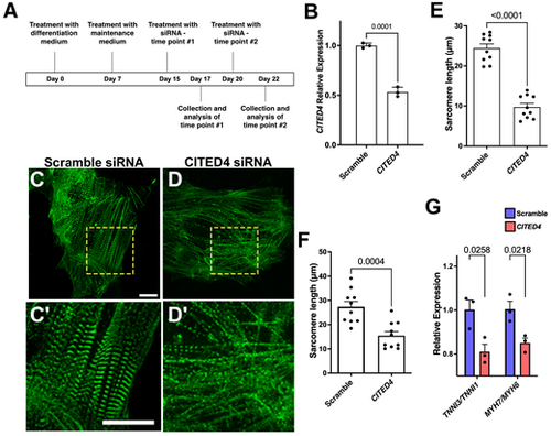 CITED4 is required for hiPSC-derived CM maturation. (A) Experimental timeline. (B) qPCR analysis for CITED4 expression in hiPSC-CMs following treatment with CITED4 siRNA or scramble control siRNA. (C-D′) ACTN2-eGFP hiPSC-CMs following treatment with scramble control (C,C′) or CITED4 (D,D′). Magnification of dashed boxed areas below show sarcomere structure based on ACTN2-GFP expression. (E,F) Quantification of sarcomere length in hiPSC-CMs at day 17 (E) and day 22 (F) following treatment with CITED4 siRNA or scramble control siRNA. (G) Gene expression ratios between TNNI3/TNNI1 and MYH7/MYH6 measured by qPCR in hiPSC-CMs following treatment with CITED4 siRNA or scramble control siRNA. Data are mean±s.e.m. Unpaired two-tailed t-test. Scale bars: 20 µm. |