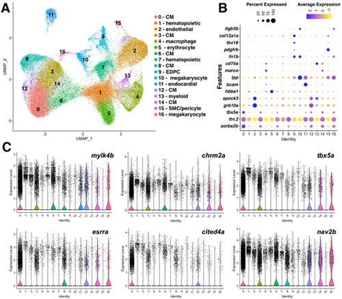 snRNA-seq of cited4a-deficient hearts reveals increased heterogeneity in CM clusters. (A) UMAP visualization of sequenced nuclei from all conditions (WT UI, WT 3 dpa, cited4am/m UI, cited4am/m 3 dpa) colored by cluster and labeled with cell type. (B) Dot plot showing differentially expressed marker genes per cluster. (C) Violin plots of CM genes to highlight these populations after integration and revealing six CM clusters with the integration of cited4am/m hearts compared to four from WT only. |