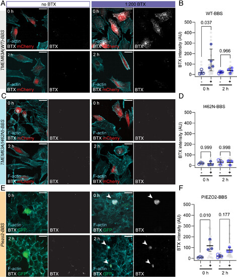TMEM63A is transiently localized to the plasma membrane. (A) Representative micrographs of HeLa-P1KO cells transfected with TMEM63A(WT)-BBS/IRES/mCherry prior to incubation with BTX-AF 647. Cells were fixed either immediately after (0 h) or 2 h after removal of BTX conjugate (2 h). BTX signal (grays), F-actin (cyan), and mCherry (red) are shown. (Scale bar, 20 µm.) (B) Quantification of BTX signal at 0 h and 2 h post labeling for conditions with (solid markers) or without (empty markers) conjugate for TMEM63A(WT)-BBS. Individual cells shown in gray, culture/transfection averages shown in blue (n = 4 transfections). (C) Representative micrographs of HeLa-P1KO cells transfected with TMEM63A(I462N)-BBS/IRES/mCherry prior to incubation with BTX-AF 647 conjugate, as in (A). (D) Quantification of BTX signal at 0 h and 2 h post labeling for conditions with (solid markers) or without (empty markers) conjugate, as in (B) (n = 3 transfections). (E) Representative micrographs of HEK-P1KO cells transfected with Piezo2-BBS/IRES/EGFP prior to incubation with BTX-AF 647 conjugate, as in (A). Arrowheads indicate transfected cells positive for BTX labeling. (F) Quantification of BTX signal at 0 h and 2 h post labeling for conditions with (solid markers) or without (empty markers), as in (B) (n = 3 transfections). Data in (B, D, and F) analyzed by one-way ANOVA followed by Tukey’s multiple comparison). |