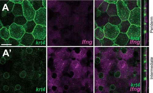 Notch signal modifiers in undifferentiated keratinocytes. (A–A’) Images showing lunatic fringe (lfng) expression in the intermediate layer of epidermis. Scale bars: 20 µm (A–A’). |