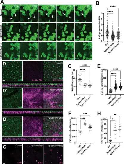 Disruption of epidermal maintenance by Interleukin-17 receptor overexpression. Overexpression of il17rd or il17ra1a in krt4+ keratinocytes results in (A, B) a significant reduction in cytoneme extension (F2, 325 = 38.48, p < 0.0001, N=328 cells, 10 larvae total), and (C) decreased Notch responsiveness (F2, 34 = 23.16, p < 0.0001, N=37 larvae total) (Figure S5E). (D–D”) The periderm is disrupted in (D’) Tg(krt4:nVenus-v2a-il17rd;krt4:lyn-EGFP;krtt1c19e:lyn-tdTomato) and (D”) Tg(krt4:nVenus-v2a-il17ra1a;krt4:lyn-EGFP;krtt1c19e:lyn-tdTomato) compared to the (D) properly arranged periderm of Tg(krt4:lyn-EGFP;krtt1c19e:lyn-tdTomato), resulting in (D’, cross-section) an increased krtt1c19e signal in the periderm (E) (F2, 287 = 109.7, p < 0.0001, N=29 larvae total) and (F) an increased number of keratinocytes in the periderm (F2, 15 = 27.79, p < 0.0001, N=18 larvae total). (G, H) Edu+ peridermal keratinocytes are significantly increased in il17 receptor overexpressed larvae (F2, 11=8.259, p=0.0065, N=14 larvae total). Statistical significances were assessed by One-way ANOVA followed by Tukey’s HSD post hoc test. Scale bars: 20µm (A, D, G). Error bars indicate mean ± SEM. |