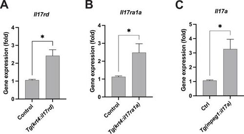 Overexpression of il17rd, il17ra1a, or il17a in transgenic animals. (A) Quantitative PCR reveals that il17rd mRNA is overexpressed in Tg(krt4:il17rd) (p=0.0159, N=3 independent experiments). (B) Quantitative PCR shows il17ra1a mRNA is overexpressed in Tg(krt4:il17ra1a) (p=0.0351, N=4 independent experiments). (C) Quantitative PCR demonstrates that il17a mRNA is overexpressed in the skin of Tg(mpeg1:il17a) animals (p=0.0183, N=4 independent experiments). Statistical significances were assessed by Student t test. Error bars indicate mean ± SEM. |