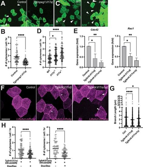 Interleukin-17 regulates keratinocyte cytonemes. (A) Representative images of krt4:palmEGFP injected cells in control or Tg(mpeg1:il17a). (B) Significant reduction in cytoneme extension in response to overexpressed il17a ligands in the epidermis (p<0.0001, N=3 larvae per group). (C) Representative images of krt4:palmEGFP injected keratinocytes in WT or il17a-/- mutants. (D) Cytoneme extension frequency increased significantly in il17a+/- or il17a-/- mutants as compared to their wild-type siblings (F2, 247=17.85, p<0.0001, N=250 cells, 9 larvae total). (E) FACS-sorted krt4+ peridermal cells from Tg(krt4:palmEGFP; krt4:il17rd) or Tg(krt4:palmEGFP; krt4:il17ra1a) show significantly reduced Cdc42 (p=0.0341 for il17rd, p=0.01 for il17ra1a, N=3 independent experiments) and Rac1 expression (p=0.0189 for il17rd, p=0.0017 for il17ra1a, N=4 independent experiments). (F) il17rd-or il17ra1a overexpressing krt4+ keratinocytes exhibit disorganization of microridges (arrowheads), with (G) significantly reduced branch lengths of microridges in the transgenic animals (F2, 2311=11.11, p<0.0001, N=68 cells, 9 larvae total). (H) Simultaneous overexpression of cdc42DN and il17rd or il17ra1a in krt4+ keratinocytes further reduces cytoneme extension (il17rd: p<0.0001, N=164 cells, 7 larvae total, il17ra1a: p<0.0001, N=115 cells, 6 larvae total). Statistical significances were assessed by One-way ANOVA followed by Tukey’s HSD post hoc test or Student t test. Scale bars: 20 µm (A, C, F). Error bars indicate mean ± SEM. |