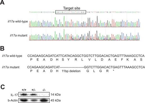 CRISPR/Cas9 induced knockout of zebrafish il17a resulting in a premature stop codon. (A) Comparison of Sanger sequencing chromatograms between wild-type and heterozygous il17a mutant zebrafish. The region targeted by the single guide RNA is highlighted within the black box. (B) Sanger sequencing of the il17a mutant reveals an 11 bp deletion, leading to the induction of a premature stop codon. (C) Western blotting confirmed that IL-17 protein expression was not detected in the homozygous il17a CRISPR mutants. |