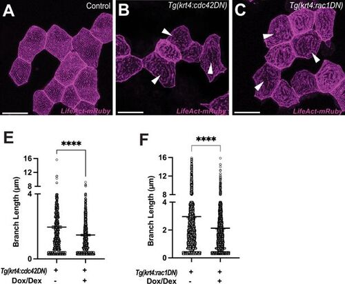 Microridge disorganization in cdc42DN or rac1DN overexpressed keratinocytes. (A–C) Arrowheads indicate disrupted microridges in cdc42DN or rac1DN overexpressed keratinocytes. Differentiated keratinocytes (krt4+) are mosaicly labeled in the Tg(krt4:TetGBDTRE-nVenus-cdc42DN) or Tg(krt4:TetGBDTRE-nVenus-rac1DN). These transgenes were induced by administering Dox and Dex. (E) Significantly reduced branch lengths of microrides in the cdc42DN (P<0.0001, N=40 cells, 7 larvae total) or (F) rac1DN overexpressed cells (p<0.0001, N=66 cells, 6 larvae total). Statistical significances were assessed by Student t test. Scale bars: 20 µm (A, B, C). Error bars indicate mean ± SEM. |