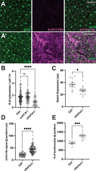 clint1 regulates epidermal maintenance via keratinocyte cytonemes. (A–A’) clint1 mutants exhibit a disorganized periderm. (B–E) clint1 mutants show (B) a lower frequency of cytoneme extension as compared to controls (WT, cx41.8-/-) (F2, 186 = 14.55, p<0.0001, N=10 larvae total), (C) reduced Notch responsiveness (p=0.0119, N=12 mutants, N=10 controls), (D) increased krtt1c19e expression in the periderm (p<0.0001, N=13 mutants, N=6 controls), and (E) a greater number of keratinocytes within the periderm (p<0.001, N=8 mutants, N=6 controls). Statistical significances were assessed by One-way ANOVA followed by Tukey’s HSD post hoc test and Student t test. Scale bars, 20 µm (A–A’). Error bars indicate mean ± SEM. |
