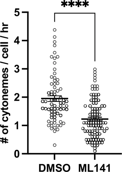 Effect of actin inhibitor treatment on cytoneme extension. (A) Treatment with the Cdc42 inhibitor (ML141) significantly reduced cytoneme extension frequency (p<0.0001, N=3 larvae per group). Statistical significance was assessed using the Student t test. Error bars indicate mean ± SEM. |