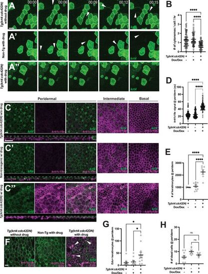 Cytoneme-mediated signaling regulates keratinocyte differentiation and proliferation. (A–A”) Still images from time-lapse movies demonstrate that cytoneme extension (arrowheads) is inhibited in keratinocytes expressing cdc42DN. (B) Expression of cdc42DN effectively inhibits cytoneme extension (F2, 231 = 25.38, p<0.0001, N=234 cells, 10 larvae total). (C) Periderm layer of Tg(krt4:TetGBDTRE-v2a-cdc42DN;krt4:lyn-EGFP;krtt1c19e:lyn-tdTomato) without drug treatment. (C’) Periderm layer of Tg(krt4:lyn-EGFP;krtt1c19e:lyn-tdTomato) with drug treatment. (C’’) Periderm layer of Tg(krt4:TetGBDTRE-v2a-cdc42DN;krt4:lyn-EGFP;krtt1c19e:lyn-tdTomato) with drug treatment exhibits disorganization. Intermediate keratinocytes were not depleted, and basal stem cells were unaffected by the manipulation. Note that, unlike the other two controls, the epidermis was not flat, resulting in partial display of basal cells in the intermediate layer and dark areas in the basal layer. Cross-section view exhibits krtt1c19e expression at the periderm. (D) Cytoneme inhibition increases krtt1c19e expression in the periderm (F2, 387 = 226.7, p<0.0001, N=39 larvae total) and leads to an increased number of keratinocytes within the periderm (E) (F2, 18 = 27.36, p<0.0001, N=21 larvae total). (F–G) Significant increase in proliferating peridermal keratinocytes in cdc42DN expressing animals (F2, 28 = 4.888, p=0.0151, N=9 larvae). (H) The cell death rate in the periderm is not affected by cytoneme inhibition, tested with acridine orange incorporation (F2, 17 = 3.192, p=0.0666, N=20 larvae total). Statistical significances were assessed by One-way ANOVA followed by Tukey’s HSD post hoc test. Scale bars: 20 µm (A–A”, C–C”, F). Error bars indicate mean ± SEM. |