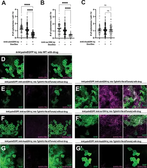 Local manipulations with dominant-negative cdc42, rac1, or rhoab in peridermal keratinocytes. (A) Mosaic expression of krt4:TetGBDTRE-cdc42DN in krt4+ keratinocytes results in a significant reduction in cytoneme extension (F2, 289=50.82, p<0.0001, N=292 cells, 9 larvae total), and (E–E’) leads to local peridermal disorganization and elevated krtt1c19e expression in krt4+ keratinocytes compared to controls shown in D and E. (B, F–F’) Similar phenotypes are observed in krt4:TetGBDTRE-rac1DN expressing peridermal keratinocytes as in krt4:TetGBDTRE-cdc42DN expressing keratinocytes (F2,239=21.43, p<0.0001, N=242 cells, 9 larvae total). (C, G–G’) However, local expression of krt4:TetGBDTRE-rhoabDN shows no effects on cytoneme extension frequency and peridermal keratinocytes (F2,237=0.08942, p=0.9145, N=240 cells, 9 larvae total). Statistical significances were assessed by One-way ANOVA followed by Tukey’s HSD post hoc test. Scale bars: 20 µm. Error bars indicate mean ± SEM. |