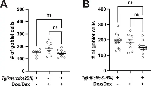 Goblet cell counts in the zebrafish epidermis. (A) Quantification of goblet cell numbers revealed no significant difference between two controls and experimental Tg(krt4:TetGBDTRE-v2a-cdc42DN) zebrafish (F2,20 = 2.763, p=0.0872, N=23 larvae total). (B) Quantification of goblet cell numbers showed no significant difference between two controls and experimental Tg(krtt1c19e:TetGBDTRE-v2a-SuHDN) zebrafish (F2, 30 = 3.040, p=0.0628, N=33 larvae total). Statistical significances were assessed by One-way ANOVA followed by Tukey’s HSD post hoc test. |