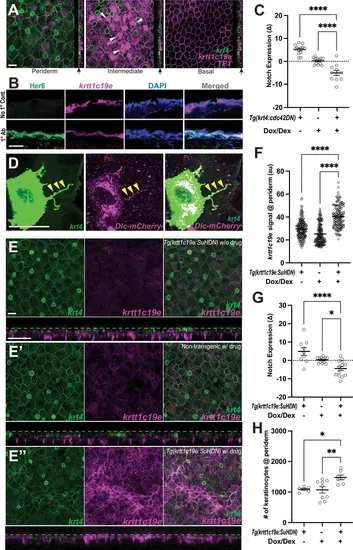 Cytonemes activate Notch in undifferentiated keratinocytes. (A) Postembryonic zebrafish epidermis of Tg(krt4:lyn-EGFP;krtt1c19e:lyn-tdTomato;TP1:H2BmCherry) shows Notch responsiveness in undifferentiated keratinocytes within the intermediate layer but not in the periderm or basal layer. (B) Zebrafish Her6 protein expression in krtt1c19e+intermediate keratinocytes. A cross-sectional view of Tg(krtt1c19e:tdtomato) epidermis shows that Her6 expression overlaps with the intermediate layer marker. (C) Inhibition of cytonemes reduces Notch responsiveness in undifferentiated keratinocytes (F2, 33 = 48.27, p < 0.0001, N=36 larvae total) (Figure S5C). (D) Expression of DeltaC-mCherry fusion protein along the cytoneme (yellow arrowheads). (E–E”) Notch inhibition by expressing SuHDN in undifferentiated keratinocytes results in the disorganization of periderm (E”). (E) Properly organized periderm layer of Tg(krtt1c19e:tetGBDTRE-v2a-SuHDN;krt4:lyn-EGFP;krtt1c19e:lyn-tdTomato) without drug treatment and (E’) Tg(krt4:lyn-EGFP;krtt1c19e:lyn-tdTomato) with drug treatment. (F) Notch inhibition increases krtt1c19e signal in the periderm (F2, 397 = 89.47, p < 0.0001, N=40 larvae total), (G) reduces Notch responsiveness in undifferentiated keratinocytes (F2, 32 = 13.18, p < 0.0001, N=35 larvae total), and leads to (H) an increased number of keratinocytes in the periderm (F2, 19 = 6.620, p = 0.0066, N=22 larvae total). Statistical significances were assessed by One-way ANOVA followed by Tukey’s HSD post hoc test. Scale bars, 20µm (A, C, D). Error bars indicate mean ± SEM. |