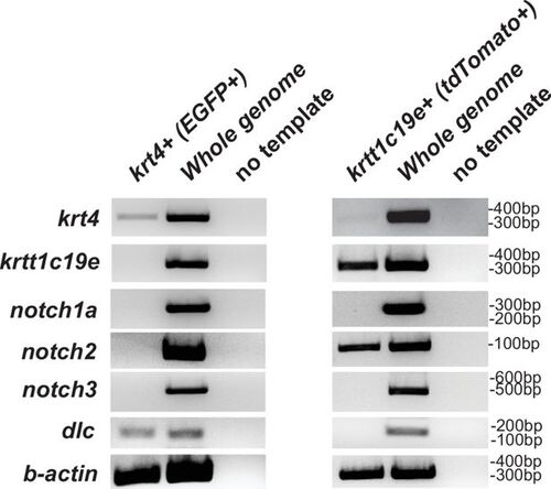 Gene expressions in keratinocytes. RT-PCR analysis revealed the endogenous expression of krt4, krtt1c19e, notch1a, notch 2, notch 3, and dlc in keratinocytes. These cells were FACS-sorted for EGFP+ cells from Tg(krt4:lyn-EGFP) and for tdTomato+ cells from Tg(krtt1c19e:tdTomato). Whole genome cDNA was used as a positive control, and reactions without a template served as negative controls. |