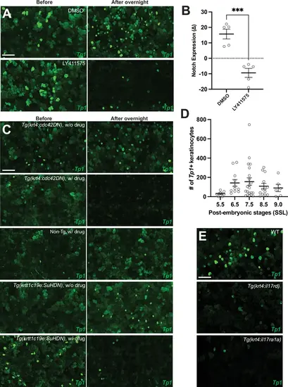 Notch reporter (Tp1) expression. (A) Images before and after treatment with DMSO and LY411575 (Notch inhibitor) in the Tg(Tp1:EGFP). (B) Treatment with LY411575 resulted in a significant overall reduction in Notch expression levels in the TP1 Notch reporter line compared to the DMSO control group (p<0.001, N=5 larvae per group). (C) Images before and after cytoneme inhibition through drug induction of cdc42DN-expression in krt4+ keratinocytes and direct inhibition of Notch signaling via drug induction of SuHDN expression in krtt1c19e+ keratinocytes, along with DMSO treatment. (D) The number of Tp1+ keratinocytes peaked during epidermal remodeling (6.5–7.5 SSL, N=58 larvae total) in zebrafish. (E) A significantly lower number of Tp1+ keratinocytes was observed in Tg(krt4:il17rd) or Tg(krt4:il17r1a1) compared to control (Figure 5C). Statistical significance was assessed by Student t test. Scale bars: 100 µm (A, C, E). Error bars indicate mean ± SEM. |