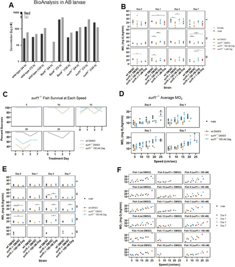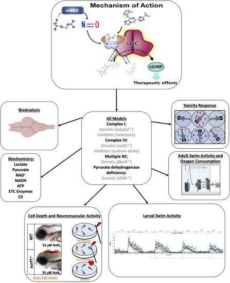 Evaluation of zag in multiple zebrafish models of mitochondrial dysfunction. Zag is a small-molecule sGC stimulator (structure at top) that increases NO-sGC-cGMP signaling. Here, we tested zag in multiple larval and adult zebrafish genetic and/or pharmacologic models of mitochondrial disease (center). Toxicity was evaluated in larval fish, and accumulation analysis (BioAnalysis) was performed on adult zebrafish brain and tail muscle. The larval models were evaluated for cell death, as evidenced by the presence of a gray brain and neuromuscular activity (lower left and upper right), swimming activity (lower right), and classical biochemical markers (middle left). The adult models were evaluated in swim activity assays (middle right, Loligo swim tunnels) while measuring oxygen consumption during a defined exercise protocol. |