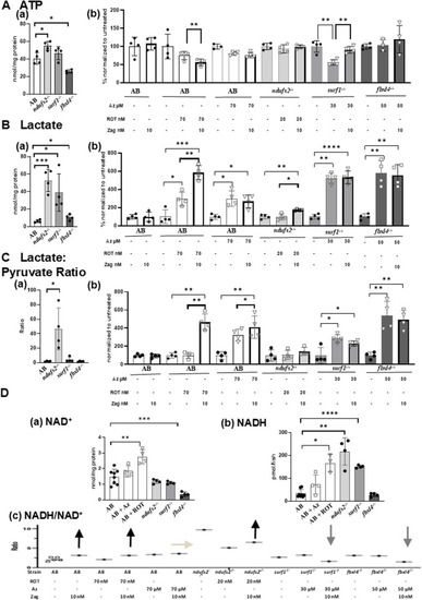 Effects of zag treatment on ATP, lactate, lactate/pyruvate, and NADH/NAD levels in pharmacological and genetic models of complex I and complex IV deficiency. |