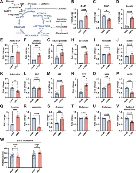 sdhb CRISPants depict broad metabolic pertubations. A Schematic of Krebs cycle intermediates (in blue) and other metabolites from related pathways (in black) which have been assayed from whole 5 dpf larvae lysates. The changes observed in sdhb CRISPants are indicated with arrowheads (green: increase; red: reduction). B–V Individual metabolite quantified from whole sdhb-CRISPant larvae (pools of 10; n = 9 pools of 10) to Cas9-injected control larvae (n = 10 pools of 10). W Oxygen consumption rate (OCR) was measured in whole Cas9-injected control and sdhb-CRISPant larvae at 2 and 5 days post-fertilization (dpf) using a Seahorse XFe96 analyzer. Unpaired t-test with two-tailed p-value calculation: * p-value < 0.05; ** p-value < 0.01; *** p-value < 0.001; **** p-value < 0.0001. |
