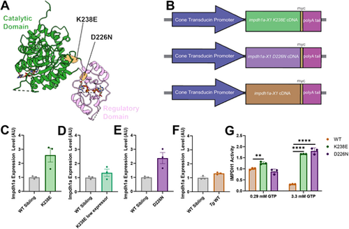 Zebrafish impdh1a transgenic line generation. (A) Two disease-associated IMPDH1 mutations (orange) on IMPDH1 monomer that were stably expressed in zebrafish. (B) Schematic describing the transgenic zebrafish lines. All lines are under a cone transducin promoter, and have a myc tag and a polyA tail. Mutant (K238E or D226N) or wild-type (WT) impdh1a cDNA were injected. (C) impdh1a expression in 7 days post fertilization (dpf) zebrafish larval eyes expressing K238E impdh1a mutation or WT sibling larval eyes. n=3 for K238E and WT siblings. Error bars are s.e.m. (D) impdh1a expression in 7 dpf zebrafish larval eyes expressing K238E impdh1a mutation or WT sibling larval eyes. n=3 for K238E and WT siblings. Error bars are s.e.m. (E) impdh1a expression in 7 dpf zebrafish larval eyes expressing D226N impdh1a mutation or WT sibling larval eyes. n=3 for D226N and WT siblings. Error bars are s.e.m. (F) impdh1a expression in 7 dpf zebrafish larval eyes expressing WT impdh1a or WT sibling larval eyes. n=3 for WT impdh1a and WT siblings. Error bars are s.e.m. (G) Purified Impdh1 protein activity assay. Protein activity in zebrafish with K238E and D226N mutations is not inhibited by high concentrations of GTP (P=9.0×109 for K238E and P=5.0×105 for D226N). Protein activity in zebrafish with K238E mutation is significantly higher at 0.29 mM GTP than for WT Impdh1a protein (P=0.003). n=3 for WT, K238E and D226N. **P<0.005, ****P<0.00005 (unpaired two-tailed t-test). Error bars are s.d. AU, arbitrary units. |