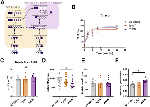 Glucose usage remains unchanged in zebrafish with D226N Impdh1a mutation. (A) Schematic illustrating the labeling pattern using 1,2 13C glucose. If glucose goes through glycolysis, two heavy carbons remain, whereas if glucose is diverted to the pentose phosphate pathway, only one heavy carbon remains. (B) Accumulation of 13C 3PG over time. There are no differences in levels of labeled 3PG over time between D226N, Tg WT or WT sibling zebrafish retinas. n=3 for all time points and groups except WT sibling at 8 h time point (n=2). Error bars are s.e.m. (C) Steady-state levels of pentose phosphate-derived 3PG (m+1). D226N mutation did not increase glucose diversion to pentose phosphate pathway. n=5 for WT sibling, and n=6 for D226N and Tg WT. ns, not significant (P=0.27) (unpaired two-tailed t-test). Error bars are s.e.m. (D) Total lactate to pyruvate levels of D226N, Tg WT or WT sibling zebrafish retinas. Zebrafish with D226N mutation have a lower lactate to pyruvate ratio. n=14 for WT sibling, and n=15 for D226N and Tg WT. *P=0.036 (unpaired two-tailed t-test). Error bars are s.e.m. (E) Total lactate levels (nmol/retina) for D226N, Tg WT or WT sibling zebrafish retinas. There were no significant differences in total lactate levels. n=14 for WT sibling, and n=15 for D226N and Tg WT. Error bars are s.e.m. (F) Total pyruvate levels (nmol/retina) for D226N, Tg WT or WT sibling zebrafish retinas. Total pyruvate was higher in zebrafish with D226N impdh1a mutation than in WT siblings. *P=0.011 (unpaired two-tailed t-test). n=14 for WT sibling, and n=15 for D226N and Tg WT. Error bars are s.e.m. |