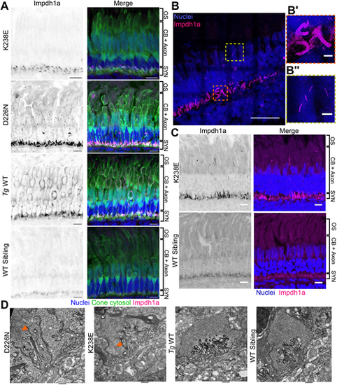 Filaments from zebrafish with Impdh1a mutations are larger and localized to synapses (K238E) or synapses and nuclei (D226N). (A) K238E Impdh1a mutant, D226N Impdh1a mutant, Tg WT or WT sibling zebrafish were crossed with TαCP:eGFP (cone cytosol, green), and retinal sections were stained with Hoechst (nuclei, blue) and a custom anti-Impdh1a antibody (magenta). K238E mutant zebrafish have larger filaments at cone synapses, and D226N mutant zebrafish have larger filaments at cone synapses and nuclei, whereas Tg WT zebrafish have diffuse cytosolic Impdh1a staining. Images show the cone layer. CB, cell bodies; OS, outer segment; SYN, synapses. Scale bars: 10 µm. (B) D226N Impdh1a mutant retinal sections expanded 5.5×. Nuclei (blue) and Impdh1a (magenta). B′ is a zoomed-in area of a cone synapse (orange dashed line box); B″ is a zoomed-in area of a Impdh1a-positive filament in cone nuclei (yellow dashed line box). Scale bars: 10 µm (B); 1 µm (B′,B″). All scale bars corrected by expansion factor (5.5). (C) K238E Impdh1a mutant (top) and WT sibling (bottom) zebrafish retinas stained with Hoechst (nuclei, blue) and a custom anti-Impdh1a antibody (magenta) at 4 months of age. The K238E mutant zebrafish retina has large filaments at the cone synapses and in cell bodies near the mitochondrial cluster, whereas the WT sibling retina has small Impdh1a filaments throughout the cell bodies and synapses. Images show the cone layer. Scale bars: 10 µm. (D) Transmission electron micrographs of cone synapses of D226N mutant, K238E mutant, Tg WT or WT sibling zebrafish. Zebrafish with Impdh1a D226N and K238E mutations have filamentous structures in synapses (orange arrowheads). Zebrafish eyes were taken prior to degeneration. Scale bars: 600 nm (D226N); 500 nm (others). |