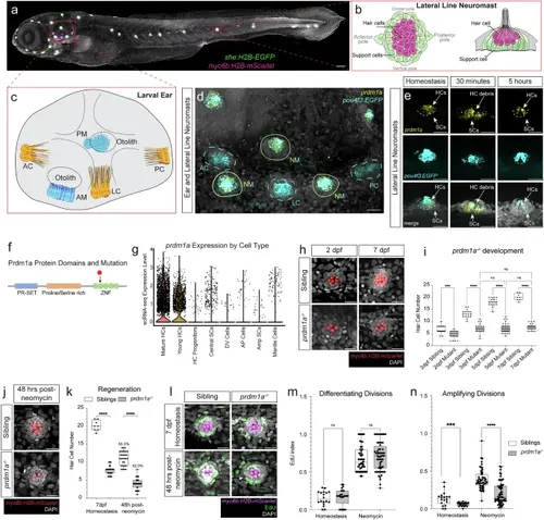 prdm1a expression is integral to hair cells with mutant phenotypes during development and regeneration. a 5 dpf representative zebrafish embryo with hair cells expressing Tg(myo6b:H2B-mScarlet) in magenta and support cells expressing Tg(she:H2B-EGFP) in green, respectively. Scale bar= 100 µm. b Modified schematic of the lateral line with hair cells and support cells in magenta and green, respectively20. c Schematic of the zebrafish ear. AC anterior crista, LC lateral crista, PC posterior crista, AM anterior macula, PM posterior macula. d HCR of lateral line neuromasts and cristae of the zebrafish ear with prdm1a probe and Tg(pou4f3:GAP-EGFP) in hair cells. Representative image of one of three larvae. Scale bars= 20 µm. e prdm1a expression in the lateral line during homeostasis, and during regeneration at 30 min and 5 h post-neomycin, with Tg(pou4f3:GAP-EGFP) in hair cells. HC hair cells, SC support cells. Representative images of one of six larvae. f Schematic of Prdm1a protein with major domains and stop codon in prdm1a mutant (black arrow). g Violin plot of prdm1a expression from sibling scRNA-seq, divided by cell type. h Hair cells labeled with Tg(myo6b:H2B-mScarlet) show developmental defects in prdm1a mutant neuromasts at 2 and 7 dpf compared to siblings. Scale bars= 20 µm. i Quantification of hair cells during development in sibling and prdm1a-/- neuromasts. n = 6–10 fish per timepoint and genotype, 3–4 neuromasts per fish. Dots represent individual neuromasts. n = 27 for 2 dpf sibling, n = 23 for 2 dpf prdm1a-/-, n = 18 for 3 dpf sibling, n = 22 for 3 dpf prdm1a-/-, n = 18 for 5 dpf sibling, n = 38 for 5 dpf prdm1a-/-, n = 8 for 7 dpf sibling, and n = 26 for 7 dpf prdm1a-/-. Two-way Anova with Tukey’s multiple comparisons test, ***p < 0.001, ****p < 0.0001. The box plots show the interquartile range (IQR), with the median (central line) and hinges (25th and 75th percentiles), and the whiskers extending from the box to the minimum and maximum values. j Hair cells labeled with Tg(myo6b:H2B-mScarlet) show regeneration defects in prdm1a-/- neuromasts 48 hours after neomycin treatment; 7 dpf. Scale bars= 20 µm. k Quantification of hair cells during regeneration and homeostasis at the same developmental timepoint, in sibling and prdm1a-/- neuromasts. The percentage of regenerated hair cells compared to homeostasis for each condition is shown above the regeneration counts. n = 6–10 fish per timepoint and genotype, 3–4 neuromasts per fish. n = 8 for 7 dpf sibling, n = 26 for 7 dpf prdm1a-/-, n = 30 for 48 hr post neomycin sibling, and n = 35 for 48 hr post neomycin prdm1a-/-. One-way Anova with Tukey’s multiple comparisons test, ****p < 0.0001. The box plots show the interquartile range (IQR), with the median (central line) and hinges (25th and 75th percentiles), and the whiskers extending from the box to the minimum and maximum values. l EdU (green) incorporation and hair cells expressing Tg(myo6b:H2B-mScarlet) (magenta) during development and regeneration in siblings and mutants. Scale bars= 20 µm. Quantification of EdU incorporation in differentiating divisions (m) and amplifying divisions (n) during regeneration in sibling and prdm1a-/- neuromasts. n = 6–8 fish per treatment and genotype, 3–4 neuromasts per fish. n = 18 for homeostasis sibling, n = 25 for homeostasis prdm1a-/-, n = 16 for neomycin sibling, n = 25 for neomycin prdm1a-/-. One-way Anova with Tukey’s multiple comparisons test, ****p < 0.0001. The box plots show the interquartile range (IQR), with the median (central line) and hinges (25th and 75th percentiles), and the whiskers extending from the box to the minimum and maximum values. |