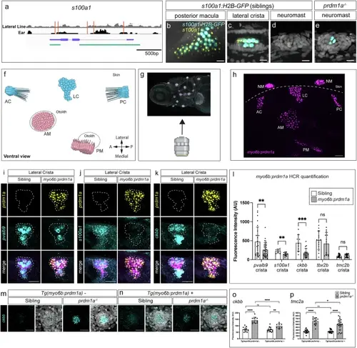 prdm1a regulates the expression of target genes in the ear. a Schematic of the s100a1 locus showing lateral line (gray) or ear (black) ATAC-seq reads with location of Prdm1 binding motifs in red. Exons and introns in purple. Cloned enhancer-promoter fusion of Tg(s100a1:H2B-EGFP) in green. s100a1 HCR (yellow) and H2B-GFP expression (cyan) in 5 dpf wild type embryos driven by Tg(s100a1:H2B-EGFP) in the posterior macula (b) and lateral crista (c). 5 dpf sibling neuromast (d) and prdm1a-/- dorsal neuromast (e). Scale bars= 10 µm. Representative images of two independent experiments. f Illustration of the zebrafish ear from a ventral view and orientation of the larva during imaging. AC anterior crista, LC lateral crista, PC posterior crista, AM anterior macula, PM posterior macula, NM neuromast. Ventral view of the zebrafish ear. Created in BioRender. Piotrowski, T. (2025) https://BioRender.com/vl2w553 (g), HCR with a prdm1a probe (magenta) in a Tg(myo6b:prdm1a) larva (h). Generated using Biorender. Representative images of six independent experiments. Scale bars= 20 µm (i–k) HCR signals for prdm1a (yellow), pvalb9, s100a1, and ckbb (cyan) in the lateral crista of sibling and the Tg(myo6:prdm1a; cryaa:mTurqoise2) embryos, respectively. Scale bars= 10 µm. Images are representative of embryos from two independent experiments. l Quantification of fluorescent signal from HCRs of pvalb9 (p = 0.0081), s100a1 (p = 0.0018), ckbb (p = 0.0003), tbx2b (p = 0.3699), and tmc2b (p = 0.2497). n = 8 embryos (two ears each) imaged per probe and genotype. Multiple unpaired two-sided t-test, ns>0.05, **p < 0.01, ***p < 0.001. Data are presented as mean ± SD. m HCRs of ckbb in sibling and prdm1a mutant neuromasts. Images representative of two independent experiments. n Expression of ckbb in prdm1a-/- hair cells using the Tg(myo6:prdm1a; cryaa:mTurqoise2) line downregulates the expression of ckbb. Scale bars= 10 µm. Images representative of two independent experiments. o Quantification of ckbb expression in the various conditions. n = 12 for sibling, n = 11 for prdm1a-/-, n = 15 for ectopic prdm1a-expressing sibling and n = 8 for ectopic prdm1a-expressing prdm1a-/-. Two-way Anova with Tukey’s multiple comparisons test, *p < 0.05, **p < 0.01(**p = 0.0069), ***p < 0.001, ****p < 0.0001. Data are presented as mean ± SD. p Quantification of tmc2a HCR fluorescence intensity in the various conditions. n = 21 for sibling, n = 12 for prdm1a-/-, n = 23 for ectopic prdm1a-expressing sibling and n = 23 for ectopic prdm1a-expressing prdm1a-/-. Two-way Anova with Tukey’s multiple comparisons test, *p < 0.05(*p = 0.0262), **p < 0.01, ***p < 0.001, ****p < 0.0001. Data are presented as mean ± SD. |