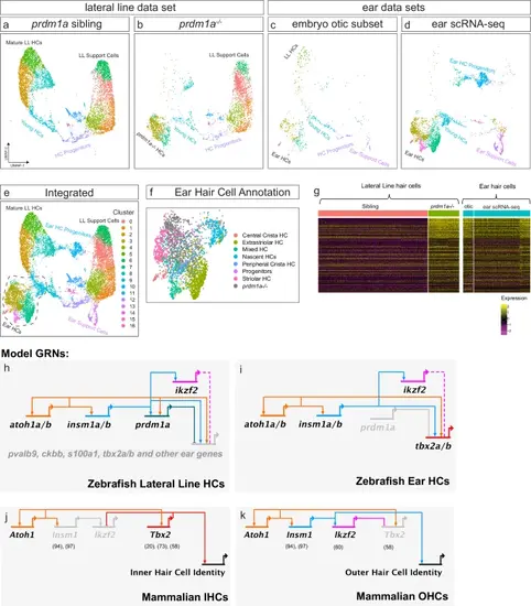 Integrating ear scRNA-seq to build a hair cell differentiation GRN.a–e UMAPs of integrated scRNA-seq, showing sibling lateral line, prdm1a-/- lateral line, embryo otic subset, ear scRNA-seq, and complete integration, respectively. f Integrated ear prdm1a-/- hair cell cluster with cells color coded by cell type from the ear scRNA-seq annotation5. prdm1a-/- hair cells are in gray. g Heatmap of mature hair cell genes of the triple integrated scRNA-seq data set, divided into prdm1a-/- lateral line cells, ear hair cells of the embryo otic subset and ear scRNA-seq data sets. h GRN of zebrafish lateral line hair cell specification and development. i GRN of zebrafish ear hair cell specification and development. j GRN of mouse inner hair cell specification and development. k GRN of mouse outer hair cell specification and development. Numbers in brackets indicate citations for the individual interactions. |