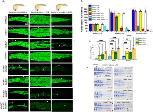 scube mutants display Hh loss-of-function phenotypes. (A) Loss of slow muscle fibres in scube mutant families at 30 hpf. In wild-type zebrafish, slow muscle fibres form a regular array with clearly defined V-shaped somites. In scube1−/−, scube3−/−, and scube1−/−scube3−/−, morphology of slow muscle fibres are comparable to wild-type siblings. In contrast, scube2−/−, scube1−/−scube2−/−, scube2−/−scube3−/−, and the triple scube mutant show severe disruption of slow muscle fibres along the body, including fibre loss (white arrows), abnormal fibre shapes (yellow arrows), and the presence of U-shaped somites (indicated by white dashed lines). The triple mutant shows the most severe phenotype, characterised by the near-complete loss of slow muscle fibres and pronounced abnormalities in the remaining fibres. (B) Slow muscle fibres were quantified in the anterior (somites 1–6), middle (somites 7–15), and posterior (somites 16–30) regions of 30 hpf embryos. In each region, bars labelled with different letters (a–m) represent statistically significant differences. For example, in anterior somites, the number of slow muscle fibres in wild-type, scube1−/−, scube3−/−, and scube1−/−scube3−/− were labelled ‘a' because they are not statistically different from each other; however, they are statistically different from scube1−/−scube2−/− (labelled ‘b'), scube2−/−scube3−/− (labelled ‘c'), and triple scube knockout (labelled ‘d'). Statistical analysis was performed using ANOVA with multiple comparisons and Bonferroni correction. The numbers of slow muscle fibres in scube1−/−, scube3−/−, and double scube1−/−scube3−/− mutants are not different from the wild-type, except in the posterior region of the double mutant, where fibre number is significantly reduced compared to wild-type siblings. Combining scube2 KO with either scube1 or scube3 KO results in a significantly greater reduction in muscle fibres than in single mutants. The triple mutant has the lowest number of slow muscle fibres among all genotypes tested. (C) Fibre gaps in scube1−/−, scube3−/−, and scube1−/−scube3−/− mutants at 30 hpf were counted. Each fibre gap comprised approximately one to four fibres. Statistical analysis showed a significant increase in the number of fibre gaps in each mutant compared to wild-type siblings. Statistical analysis was performed using ANOVA with multiple comparisons and Bonferroni correction. (D) myoD staining in the scube mutant family at 15-somite stage, n = 3 to 7 per mutant. Dorsal views with the head oriented to the left. In wild-type, single, and double scube mutants, myoD expression is expressed in adaxial cells and somites. In the triple mutant (scube1−/−scube2−/−scube3−/−), myoD expression in posterior adaxial cells is lost (red arrow), indicating severe disruption of Hh signalling. |