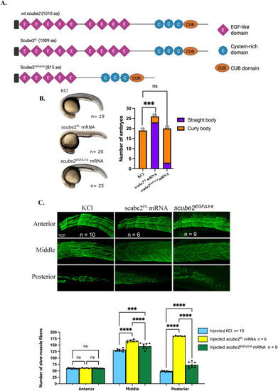 Rescue of scube2−/−phenotype by scube2FLandscube2EGFΔ3-6mRNAs. (A) The Scube2FL protein is predicted to closely resemble the wild-type Scube2 with 9 EGF-like domains, while the Scube2EGFΔ3-6 peptide only has 5 EGF-like domains. (B) Morphological analysis of scube2−/− larvae at 30 hpf following 0.2 M KCl injection showed that all scube2−/− larvae exhibited a curled body axis (19/19). Injection of scube2FL mRNA restored a straight body axis in most larvae (23/26), while injection of scube2EGFΔ3-6 mRNA did not rescue normal morphology, with most larvae remaining curled (17/20). The difference between the control group (injected with 0.2 M KCl) and the scube2FL mRNA group was statistically significant (Fisher's exact test with Bonferroni correction, p < 0.001). No significant difference was observed between the control and scube2EGFΔ3-6 mRNA groups (p = 0.681). (C) Slow muscle immunostaining in scube2−/− embryos at 30 hpf following rescue with scube2FL or scube2EGFΔ3-6 mRNAs revealed that injection of either scube2FL or scube2EGFΔ3-6 mRNA led to a significant increase in slow muscle fibre number compared to the control. The increase was greater in scube2−/−embryos rescued with scube2FL than with scube2EGFΔ3-6 (ANOVA with Bonferroni correction, p < 0.0001). |