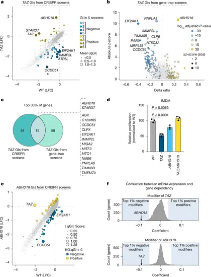 Genetic screens identify ABHD18 as a suppressor of TAZ-mutant fitness defects. a, Scatterplot depicting the genetic effects resulting from pooled CRISPR screens in HAP1 wild-type (WT, n = 39) and TAZ-KO (n = 5, clones 1 and 2) cells plotted as log2-transformed fold change (LFC) values and scaled by quantitative GI (qGI) score. Significant GIs are labelled (mean |qGI | > 0.5, false discovery rate (FDR) < 0.1 n = 5 screens). The node size corresponds to the mean absolute qGI score. b, Scatterplot of viability data from gene-trap mutagenesis screens consisting of two TAZ-KO maps (n = 2) compared with WT controls (n = 4). The Δ(ratioTAZ − ratioWT) is the differential ratio between TAZ-KO and WT cells. The z-score represents the standardized effect size of the TAZ-KO screens compared with a reference of 39 public maps. Significance was determined by Fisher’s exact test (TAZ-KO versus WT; Padj < 0.05) and a binomial test (adjusted P (Padj) < 0.05; TAZ-KO sense versus antisense). The top significant hits are shown. c, Venn diagram showing the overlap of TAZ genetic modifiers (positive and negative) between orthogonal screening methods. The top 30% of genes from each screen were included, ranked by combined qGI and FDR (CRISPR screens) and z-score (gene-trap screens). e, Scatterplot of ABHD18 negative and positive GIs from HAP1 WT (n = 39) and ABHD18-KO (n = 1) pooled CRISPR screens, depicted as in a. d, Bar plot of relative cell proliferation measurements in HAP1 WT, TAZ-KO, ABHD18-KO and TAZ;ABHD18 double-KO cells. Data are presented as mean ± s.d.; n = 3 biological replicates, each performed in technical triplicate with significance (WT versus TAZ, Padj = 0; WT versus ABHD18-KO, Padj = 0.0053) determined by one-way analysis of variance (ANOVA) followed by Dunnett’s post-hoc test. f, Distribution of TAZ (top) and ABHD18 (bottom) genetic modifier likelihood coefficients determined from DepMap data. The top 1% of putative modifiers are shaded. ABHD18 (top) and TAZ (bottom) are indicated. |