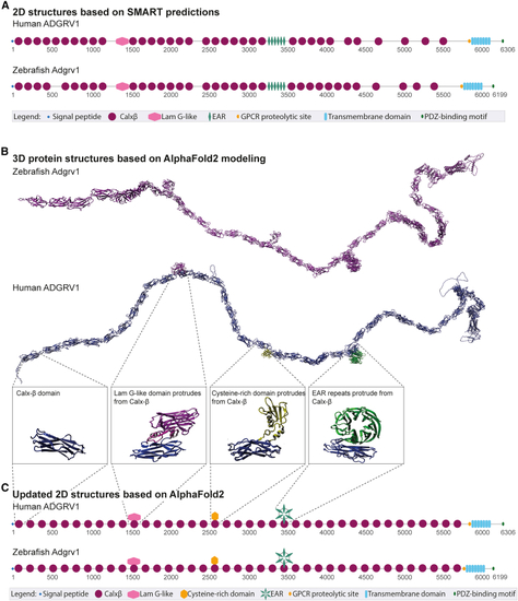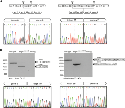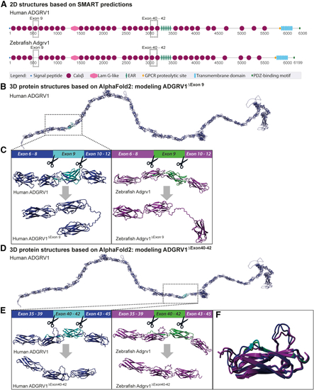 (A) Schematic representation of the protein domain structure of the large isoform (isoform B) of human and zebrafish ADGRV1, based on 2D-SMART protein predictions. Regions encoded by exon 9 and exons 40–42 are highlighted with dashed boxes. (B) |