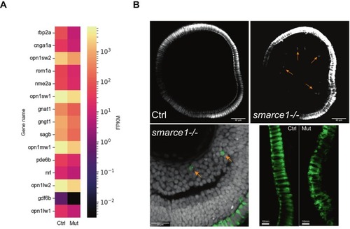 Terminal differentiation of PRs is defective. (A) Heatmap showing the top downregulated genes of the Phototransduction Term. The bar shows the average FPKM value of three replicates. Yellow color indicates a high expression level, and black color indicates a low expression level. Genes are organized according to their Padj value from small to large (range 3.8–64 to 0.00749). (B) Confocal sections of 5 dpf Ctrl and smarce1-/- retinas stained with the Zpr1 antibody (green). Ectopic cones are visible in inner locations (yellow arrows) in the mutant images. Right lower panel shows a closer caption of the PRs where disorganization can be appreciated. Scale bars, upper panel:40 μm; left lower panel: 20 μm; right lower panel: 10 μm. (For interpretation of the references to colour in this figure legend, the reader is referred to the web version of this article.) |