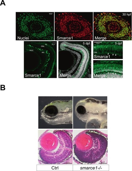 Immunodetection of Smarce1 in retinas at 30 hpf and 5 dpf. (A) Confocal sections of a 30 hpf retina stained with a Smarce1 antibody (green) (upper panel); the signal is detected in all RPCs nuclei. Cryostat histological sections of 5 dpf retinas showing DAPI stained nuclei (gray) and Smarce1 signal (green) in amacrine cells (Am), retinal ganglion cells (RGC), Photoreceptor layer (PL), and outer nuclear layer (ONL) (lower panel). The high magnification images on the right show Smarce1 signal in most photoreceptor nuclei, except for a few basally-localized ones, which appear negative (arrowheads). Signal in outer segments (PL) is due to autofluorescence. (B) Bright-field photographs of wild type (Ctrl) and mutant (smarce1-/-) heads showing the eye size reduction (upper panel). H&E sections of 5 dpf wild type (Ctrl) and mutant (smarce1-/-) retinas (lower panel). Scale bars in A: 20 μm; in B: 50 μm. (For interpretation of the references to colour in this figure legend, the reader is referred to the web version of this article.) |