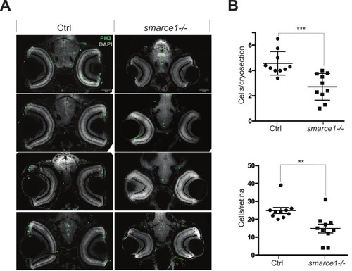 Immunodetection of Smarce1 in retinas at 30 hpf and 5 dpf. (A) Confocal sections of a 30 hpf retina stained with a Smarce1 antibody (green) (upper panel); the signal is detected in all RPCs nuclei. Cryostat histological sections of 5 dpf retinas showing DAPI stained nuclei (gray) and Smarce1 signal (green) in amacrine cells (Am), retinal ganglion cells (RGC), Photoreceptor layer (PL), and outer nuclear layer (ONL) (lower panel). The high magnification images on the right show Smarce1 signal in most photoreceptor nuclei, except for a few basally-localized ones, which appear negative (arrowheads). Signal in outer segments (PL) is due to autofluorescence. (B) Bright-field photographs of wild type (Ctrl) and mutant (smarce1-/-) heads showing the eye size reduction (upper panel). H&E sections of 5 dpf wild type (Ctrl) and mutant (smarce1-/-) retinas (lower panel). Scale bars in A: 20 μm; in B: 50 μm. (For interpretation of the references to colour in this figure legend, the reader is referred to the web version of this article.) |
