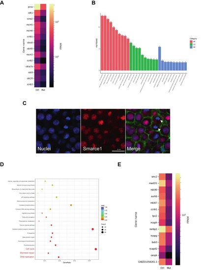 Transcriptomic analysis of smarce1-mutant retinas confirms downregulation of cell cycle and mitosis genes. (A) Heatmap showing a list of the top downregulated genes of the Cell Cycle Term. The color bar shows the average FPKM value of three replicates. Yellow color indicates a high expression level, and black color indicates a low expression level. Genes are organized according to their Padj value from small to large (range 1.53e-57 to 3.7e-08). (B) GO enrichment analysis. The most significant 30 Terms were selected for display; the x-axis indicates GO Term, and the y-axis displays GO Term's level of significance of enrichment, expressed as −log10 (padj). Different colors represent different functional categories; BP: biological processes, CC: cell components, MF: molecular function. (C) Confocal images showing immunodetection of Smarce1 in embryos at the oblong stage (3.7 hpf). DAPI staining (blue) labels nuclei in S-phase and chromosomes at mitosis. Phalloidin (green) marks the cell cortex. Smarce1 signal (red) is localized to nuclei but is absent from mitotic chromosomes. Late anaphase/early telophase chromosomes in a dividing cell are indicated (white arrow heads). Scale bar: 20 μm. (D) KEGG enrichment results showing that the top downregulated pathways are related to the cell cycle (red characters); the most significant 20 KEGG downregulated pathways are displayed. The x-axis represents the ratio of the number of differential genes linked with the KEGG pathway to the total number of differential genes; the y-axis lists the KEGG pathways. The size of a point represents the number of genes annotated to a specific KEGG pathway. The color from red to purple represents the significant level of enrichment. (E) Heatmap showing the top downregulated genes of the Mitosis Term. The bar shows the average FPKM value of three replicates. Yellow color indicates a high expression level, and black color indicates a low expression level. Genes are organized according to their Padj value from small to large (range 1.32e-36 to 3.3e-18). (For interpretation of the references to colour in this figure legend, the reader is referred to the web version of this article.) |