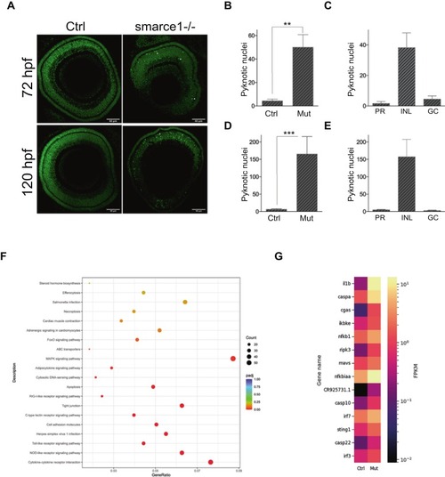 Cell death of retinal neurons in the smarce1-mutants. (A) Confocal sections of 72 hpf and 5 dpf retinas stained with methyl green. Pyknotic nuclei representing apoptotic cells exhibit enhanced fluorescence (examples marked with an asterisk). Scale bar: 40 μm. (B and D). Quantification of the total number of pyknotic nuclei in WT (Ctrl) and smarce1-/- (Mut) retinas at 72 hpf (B) and 5 dpf (D). At 72 hpf, n = 8 for both, control and smarce1-/- mutants; at 5 dpf, n = 8 for control and n = 11 for mutant retinas. A Welch́s t-test was performed showing a significant increase in pyknotic nuclei in smarce-/- samples compared to Ctrl. At 72 hpf (t6 = 4.11, p** = 0.0058); at 5 dpf (U = 0,*** p = 0.0004). (C and E). Quantification of the number of pyknotic nuclei per layer in the smarce1-/- retinas at 72 hpf (C) and 5 dpf (E). PR: photoreceptors, INL: inner nuclear layer, GC, ganglion cell layer. (F) KEGG enrichment results show the upregulation of the apoptosis pathway (red), the most significant 20 KEGG upregulated pathways were selected for display. The x-axis represents the ratio of the number of differential genes linked with the KEGG pathway to the total number of differential genes; the y-axis lists the KEGG pathway. The size of a point represents the number of genes annotated to a specific KEGG pathway. The color from red to purple represents the significant level of enrichment. (G) Heatmap showing the top upregulated genes of the Apoptosis Term. The bar shows the average FPKM value of three replicates. Yellow color indicates a high expression level, and black color indicates a low expression level. Genes are organized according to their Padj value from small to large (range 1.72e-93 to 0.021). (For interpretation of the references to colour in this figure legend, the reader is referred to the web version of this article.) |