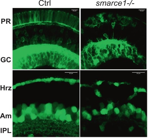 Defective organization of ganglion, amacrine, and horizontal neurons. Confocal sections of 5 dpf Ctrl and smarce1-/- retinas expressing the ganglion cell reporter atoh7:gapGFP (upper panel) and ptf1a:cytGFP (lower panel). GC, ganglion cells; PR, photoreceptors; Hrz, horizontal cells; Am, amacrine cells; IPL, inner plexiform layer. Scale bars 10 μm. |