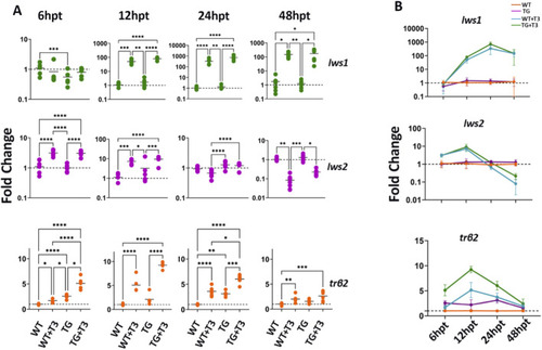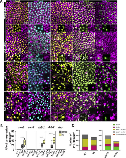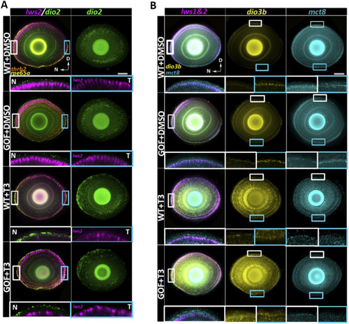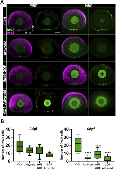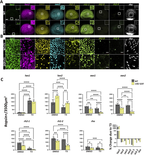 Confocal visualization of opsin and thyroid hormone-related gene expression in 4dpf wildtype and |