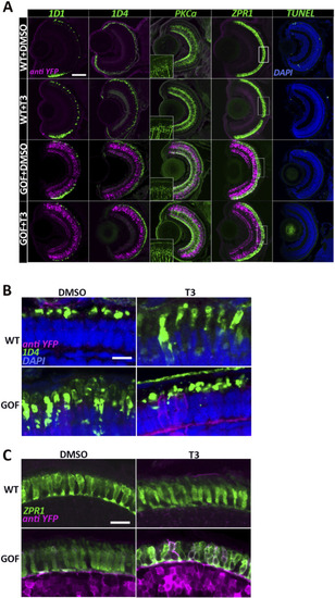 Trβ2 overexpression and T3 treatment alter cone morphology and/or distribution of selected cone antigens. |
