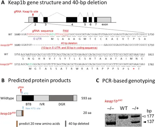 Generation and molecular characterization of the keap1bdl40 knockout allele using CRISPR/Cas9. A Gene structure and deletion. Zebrafish keap1b gene showing gRNA target site (red arrow) at the 5’-UTR/exon 2 boundary. The 40-bp deletion removes 10 bp from 5’-UTR, the ATG start codon (3 bp), and 27 bp from exon 2. Translation initiates from a downstream out-of-frame ATG (green), producing a 20-amino-acid peptide (MGTASSATRWRATRPPPSPS*) terminated by a premature stop codon (asterisk). B Protein products. Wild-type: 593-aa protein with BTB, IVR, and DGR domains. Mutant: 20-aa non-functional peptide (orange) lacking all domains. C PCR genotyping. Gel electrophoresis showing wild-type (177 bp), mutant (137 bp), and heterozygous (both bands) genotypes |