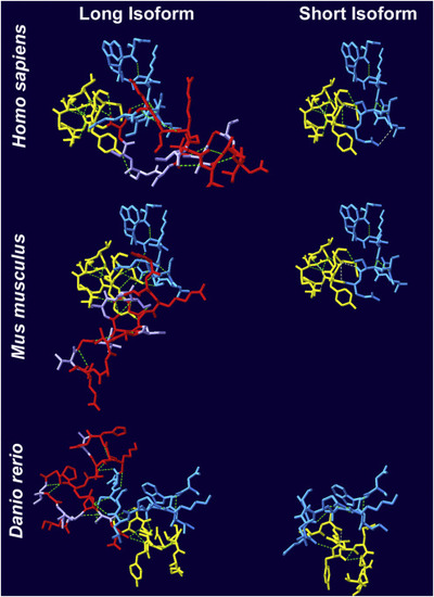H-bonds and phosphorylation sites between two isoforms. The number and location of H-Bond are compared using Swiss-PdbViewer. The eighteen amino acids in long isoform are shown in red, and the ten amino acids before and after this region are labeled in blue and yellow, respectively. The H-bonds (≤ 3.3) are displayed in green dash line, and the H-Bonds (> 3.3) are labeled in gray dash line. There are six to eight H-bonds among the eighteen amino acids region in different species. Among the inserting eighteen amino acids, the phosphorylation sites are displayed in light cyan. There are six phosphorylation sites in this region of human and mouse protein and five phosphorylation sites in that of zebrafish. (For interpretation of the references to colour in this figure legend, the reader is referred to the web version of this article.) |