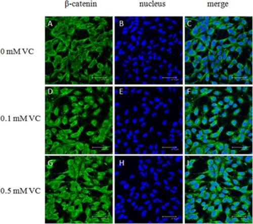 Effect of VC on the immunofluorescence of β-catenin in the ZF4 cells of zebrafish. (A,D,G): β-catenin, green; (B,E,H): nucleus, blue; (C,F,I): green and blue merger. Bar: 37.5 μm. |