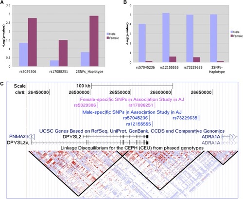 Identification of two sex-specific haplotypes with SZ susceptibility in 729 AJ SZ and 1542 AJ controls. (A) A 2-SNP (rs5029306, rs17088251) haplotype for female- specific SZ risk in AJ. (B) A 3-SNP (rs57045236, rs12155555, rs73229635) haplotype for male-specific SZ risk in AJ. (C) The same five SNPs shown in the UCSC genome browser (genome.ucsc.edu). The LD blocks, indicated by black lines, show that the SZ associated SNPs are in LD with |