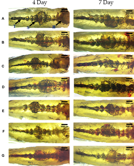 Figure 4 Structural examination of the kidney at 10X magnification. The three regions of the kidney Head (H), Trunk or Saddle (S), and Tail (T) extend from the anterior to the posterior of the body. (A) Normal Control (B). Humanized Zebrafish with xenotransplanted A549 cells (HZF) (C). Diseased fish with SARS-CoV-2 spike protein (HZF-SARS-CoV-2-S) (D). Dexamethasone (0.08 µg/kg) treatment (E). Divya-Swasari-Vati treatment (6 µg/kg) (F). Divya-Swasari-Vati treatment (28 µg/kg) (G). Divya-Swasari-Vati treatment (142 µg/kg). |