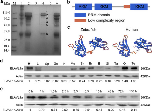 Identification of ELAVL1a as an LTA-binding protein.a SDS-PAGE of the proteins isolated from the embryos extracts of zebrafish on LTA-conjugated Sepharose CL-4B affinity resin. Lane M, marker; lane 1, embryos extracts; lane 2, effluent fractions after Tris-HCl wash; lane 3, effluent fractions after throughout elution; lane 4, effluent fractions containing the absorbed proteins; lane 5, effluent fractions from LTA-conjugated Sepharose CL-4B affinity resin with no embryos extracts loaded; lane 6, effluent fractions from Sepharose CL-4B affinity resin with no conjugated LTA. b Domain structure of ELAVL1a predicted by the SMART program. c 3D structures of the ELAVL1a generated by SWISS-MODEL online software using human ELAVL1 (PDB code: 4egl.1.A) as the model. d Western blotting of ELAVL1a in different tissues including heart (H), liver (L), spleen (Sp), gut (Gu), kidney (K), muscle (Mu), skin (Sk), brain (Br), eye (E), gill (Gi), ovary (O), testis (Te) and tail (Ta). e Western blotting of ELAVL1a at the different developmental stages including zygote (0 h), 4-cell stage (about 1 h), 16-cell stage (~1.5 h), 256-cell stage (~2.5 h), high blastula stage (~3.5 h), 50% epiboly stage (~5.5 h), 10-somite stage (~15 h), 2-day post-fertilization (2-dpf), 3-dpf, and 7-dpf. The values of the quantification of Western blotting were given as well. Data are presented as the means ± SD.