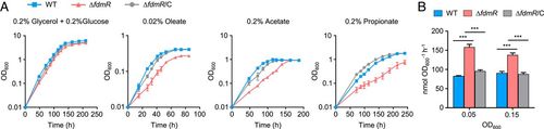 FdmR deficiency results in impaired growth and increased substrate consumption of M. marinum on fatty acids. (A) Growth of M. marinum wild type, ∆fdmR mutant, and complemented strain ∆fdmR/C in modified Sauton’s medium supplemented with glycerol and glucose, oleate, acetate, or propionate as the only carbon source. (B) Oleate consumption rate per OD600. Data shown are mean ± SD (n = 3 independent experiments). ***P < 0.001, by unpaired two-tailed t test. |