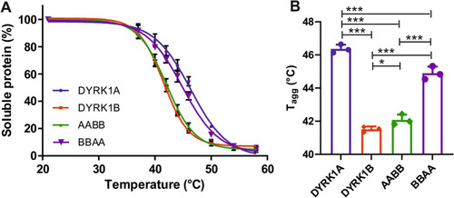 CETSA melt curves of wild type and chimeric DYRK1 constructs. Intact HEK293 cells with stable overexpression of the indicated HiBiT-tagged DYRK constructs were incubated for 3.5 min at variable temperatures. After freeze–thaw lysis, samples were centrifuged and the amount of DYRK constructs in the soluble fraction was measured using the HiBiT lytic assay. The graphs represent the means and SD of 3 independent experiments. ( |