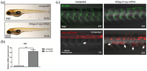 Overexpression of npy induced the development of peripheral nerve systems in zebrafish embryos: (a) lateral view of untreated embryos and npy-mRNA-injected embryos at 5 days after fertilization, (b) qRT-PCR analysis of npy using untreated embryos and npy-mRNA-injected embryos (***p < 0.001), and (c) lateral view of confocal imaging at 5 days of post-fertilization untreated embryos and npy-mRNA-injected embryos from fli1: GFP; huc: mCherry transgenic zebrafish. White arrow indicates the peripheral nerve system in zebrafish embryos. |