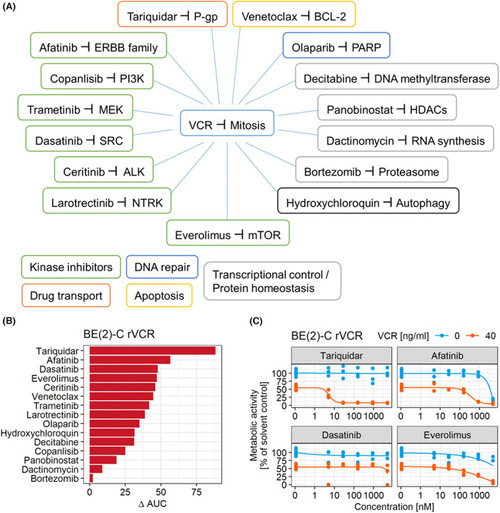 Functional screen identifies ERBB4 and P‐gp inhibitors to break resistance. (A) Schematic representation of the drugs and their targets. Drug classes are indicated. (B) A metabolic activity screen read‐out (CellTiterGlo) of combination treatment of VCR with 15 anticancer drugs (14 clinically approved) was performed with BE(2)‐C rVCR. The cells were treated with 0, 5, 28, 158, 889, and 5000 n |