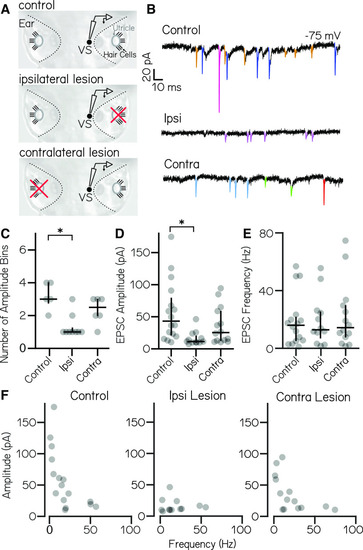 High-amplitude spontaneous excitatory inputs originate in the ipsilateral ear. |